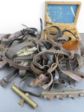 A large number of leather slings, wooden box, a 1944 US Navy 40mm clip M3 piece of metalwork, etc.