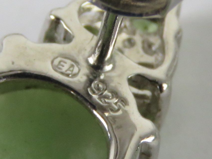 A pair of silver and green stone earrings with butterfly back stamped 925, each measuring 15 x 10mm. In presentation box.