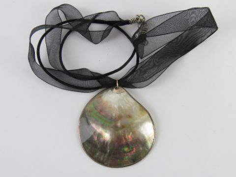 A mother of pearl pendant on ribbon necklace having 925 silver clasp.