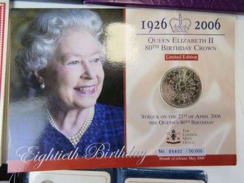 A collection of commemorative coins including Queen Elizabeth II 80th BIrthday crown, 1985, 2006, etc.