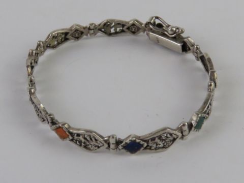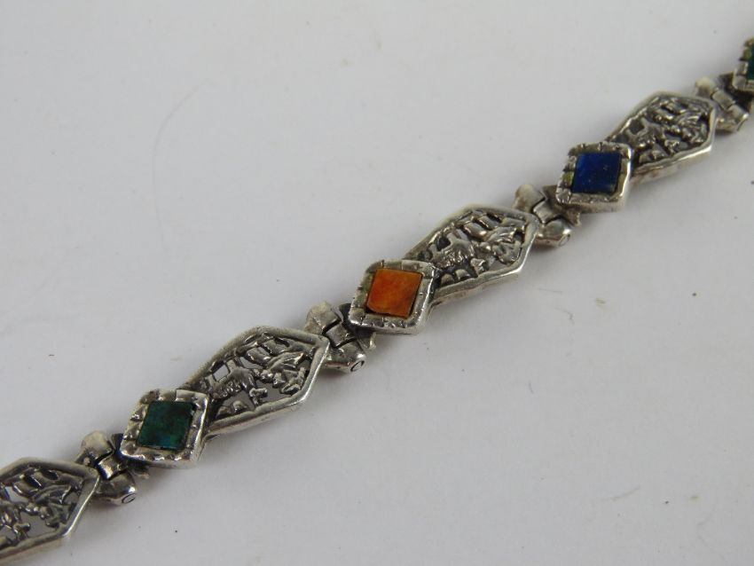 A South American silver bracelet having hinged panels featuring Llamas upon and set with hard stones including Lapis Lazuli and Malachite, stamped 950 and measuring 19cm in length.