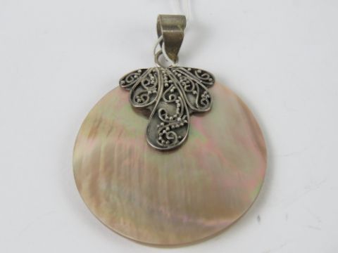 A silver and mother of pearl pendant, stamped 925, 3.5cm dia.