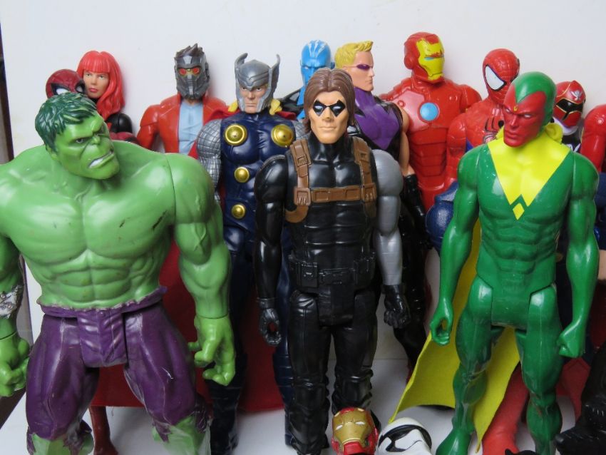 A quantity of assorted Action Hero figurines inc Guardians of the Galaxy, Avengers, etc. Various sizes, Thor standing 31cm high.