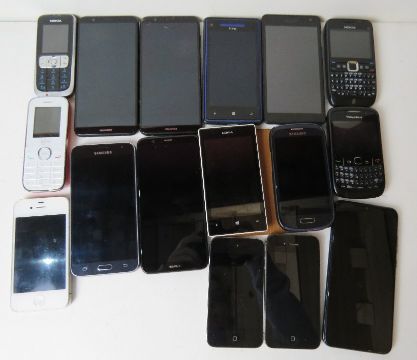 A large quantity of mobile phones; Blackberry Curve, Nokia, Huawei Honor 10 Lite A1, HTC model PM23200, Windows phone 8X in blue with protective cover, Huawei FIG-LX1 P, Apple iPhone 4s A1387 in black, Samsung Galaxy SIII mini G18190 in blue with protective case, etc. Also an Apple iPod Touch 32GB EMC240. Untested.