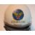 United States Air Force Korean War Type P-1A Protective Flying Helmet; white fiberglass shell with leather strap webbing; brown rubber edge; leather oxygen mask straps with 3 snaps each; attached microphone cord in back of helmet; United States Air Force winged star insignia decal on front of helmet; natural coloured cotton adjustable neck strap with snap.