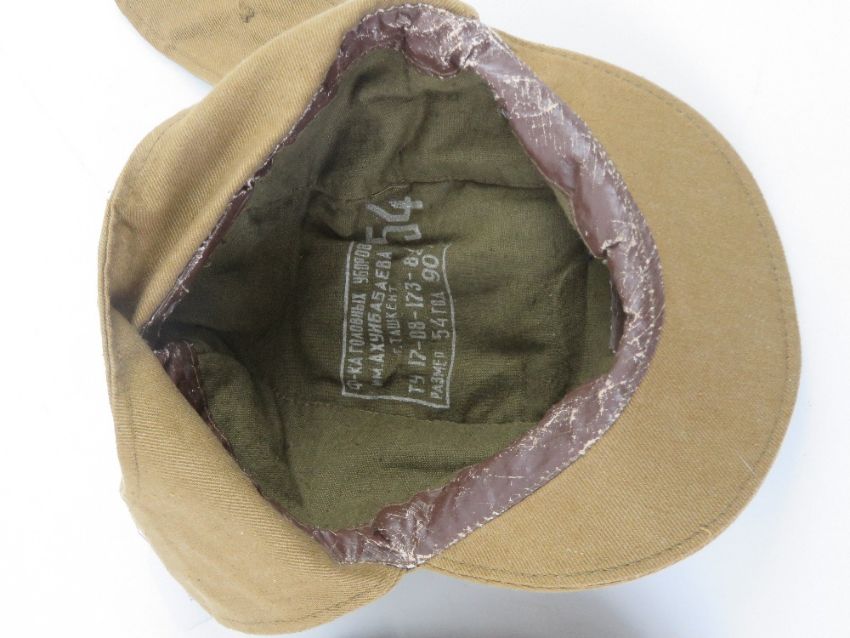 Two military ski type hats in green fabric, Russian? text and numbered 54.
