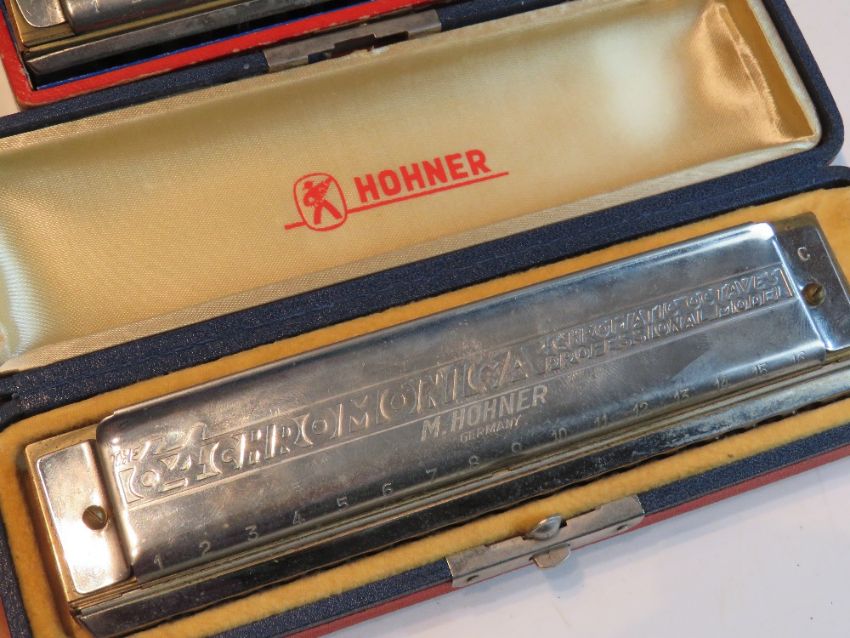 Two Harmonicas. One being 64 Chrominca by M.Hohner, made in Germany, the other being the Super Chromonica by H.Hohner, both in boxes.