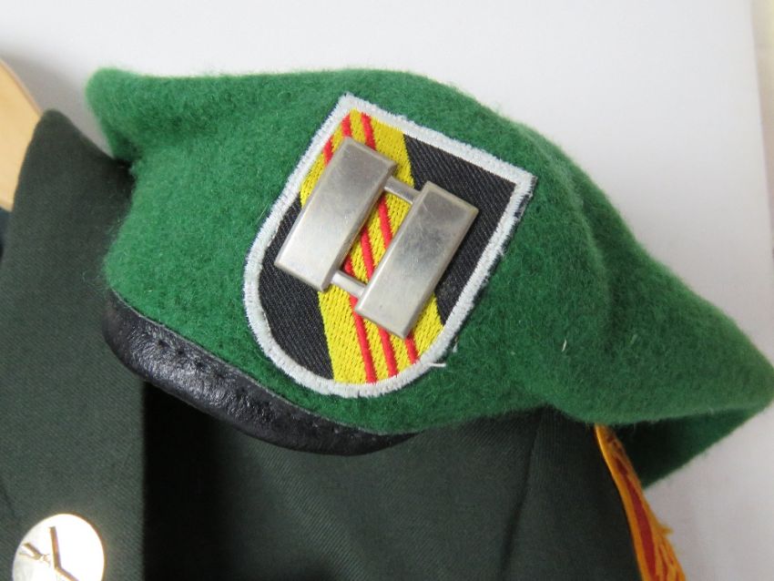 A US Green Army jacket by De Rossi & Son, size 40R, bearing a 17th Field Artillery Brigade arm patch and a Big Red One patch. Together with a beret from the Vietnam 5th Special Forces, and a pair of Army Wool type 1.31XL trousers.
