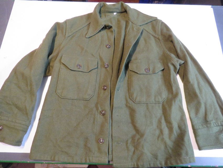 A US wool jacket size medium, a US Air Force shirt, US Navy shirt with Bars, badges and name tag and two white belts.