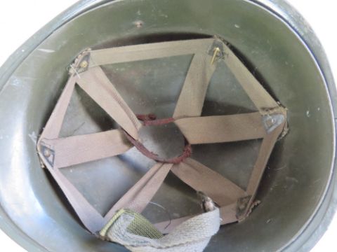 A US M1 helmet with liner and reproduction chin strap, liner dated 1971. Together with a repainted Vietnam US M1 helmet with liner.