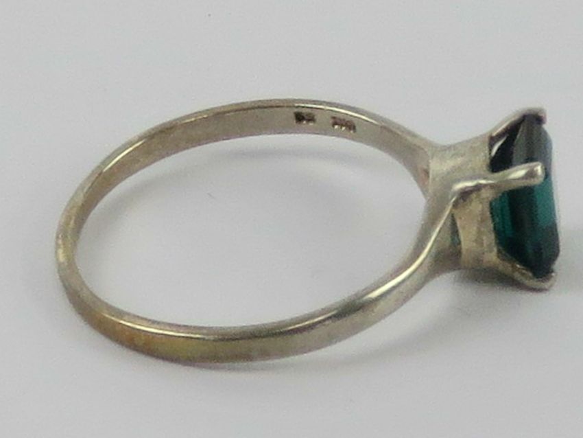 A silver ring having central rectangular cut rich green stone, stamped 925, size S.