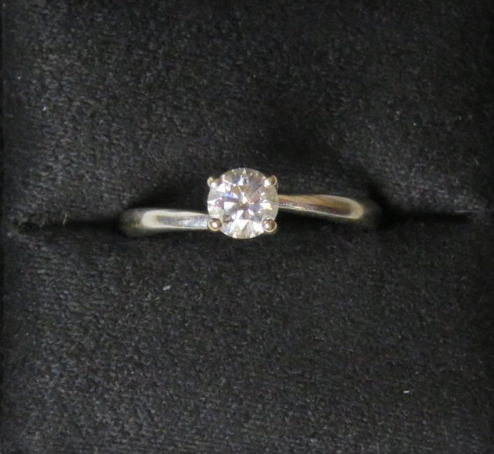 A 0.53ct solitaire diamond ring with GSI certificate, the natural round brilliant diamond set in 18ct white gold, Colour G, Clarity I1. In original Tolkowsky presentation box with outer box and certificate cover.