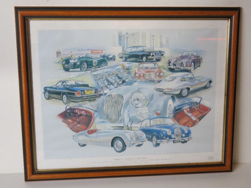 Print; 'Grace Space and Pace' featuring a selection of vintage Jaguar Motor Cars inc the 420G, XK120, E Type, etc. Measuring approx 40 x 50cm inc frame.