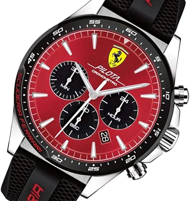 A Scuderia Ferrari Pilota Chronograph quartz wristwatch on back silicone bracelet, as new in sealed packaging. Red cockpit style dial. Stainless steel 45mm case. Stop Watch, 24-hour Display, Luminous Hands, Luminous Numbers.