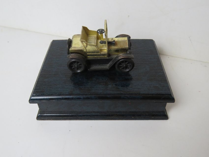 A tabletop display box having vintage model motorcar upon and opening to reveal two packs of playing cars having vintage motorcar image verso.
