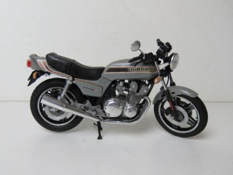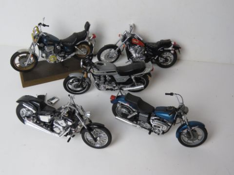 A set of five scale model vintage motorbikes inc Yamaha and Honda.