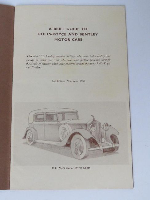 A Brief Guide to Rolls Royce and Bentley cars 1965 - 1975, 3rd Edition 1965.