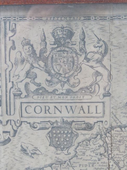Map; Cornwall, published by John Speed, discoloured and a/f (cracking to right of centre), framed and in good heavily glazed frame, overall 54 x 40.5cm.