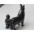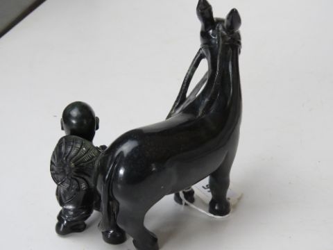 A carved serpentine Oriental figurine of a man with donkey, a/f, raised over carved hard wood base. Standing 21cm high inc base.