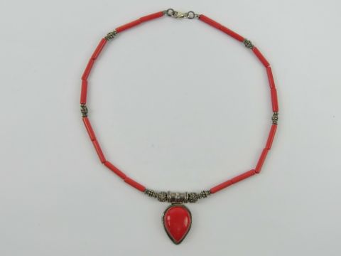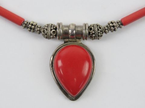 A silver and faux coral necklace having teardrop shaped pendant upon, stamped 925.