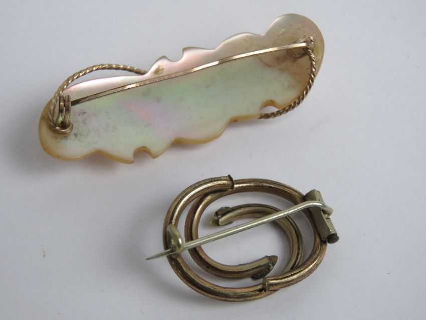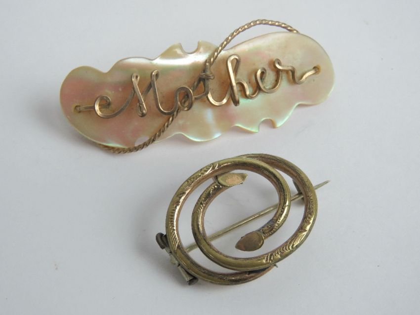 Two vintage brooches 'Mother' on mother of pearl, 5cm wide, and another in pinchbech.