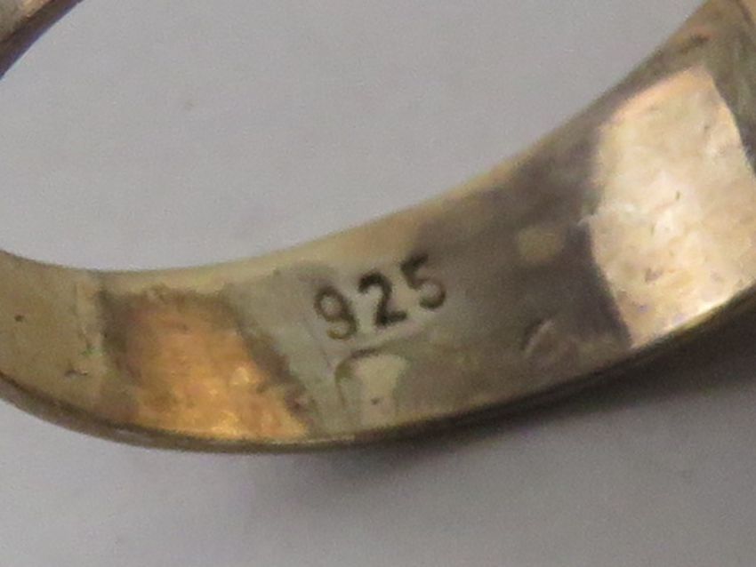 A handmade Indo-Asian design ring set with banded carnelian type stone, stamped 925, size P-Q.