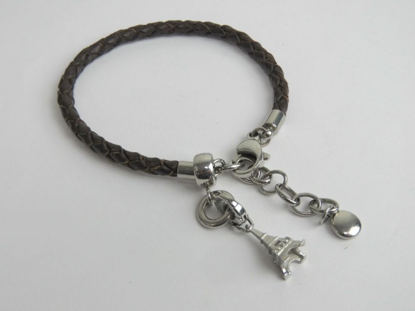 A designer charm bracelet by Fossil, braided leather with Eiffel Tower charm upon.