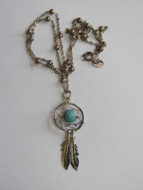A Native American style dreamcatcher pendant on chain, chain stamped 925 having turquoise bead to centre of pendant.