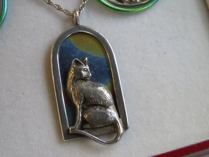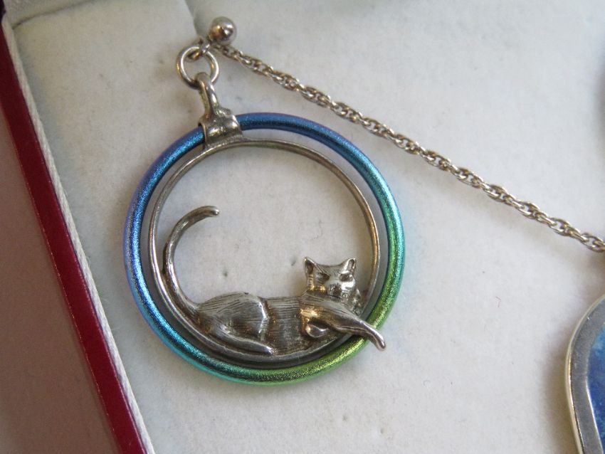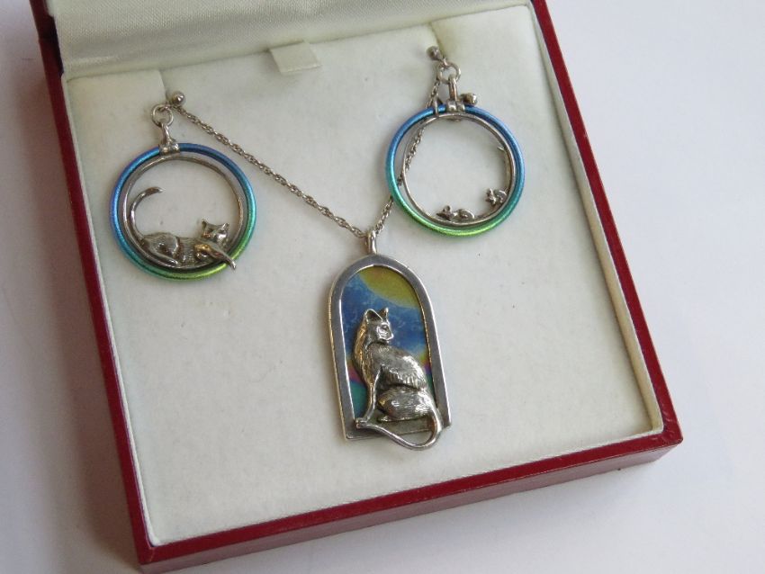 A delightful suite of cat themed jewellery comprising necklace and earrings in multicoloured titanium with silver chain, within presentation box.