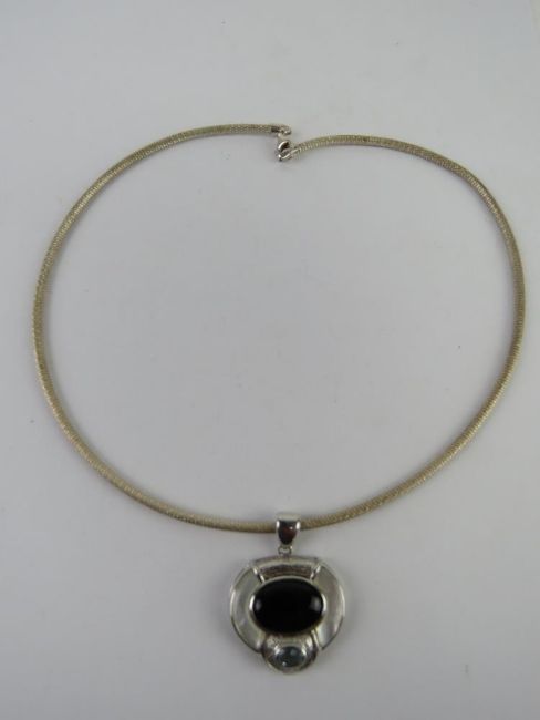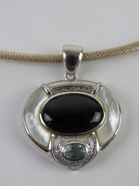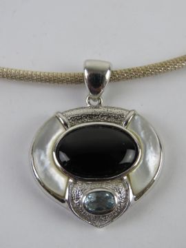 An hallmark silver pendant set with mother of pearl and onyz on a 925 silver chain.