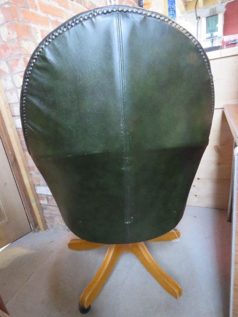 A green leatherette Chesterfield style office chair having high back and pine base, some casters missing/mechamism for refurbishment.