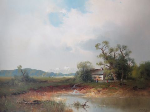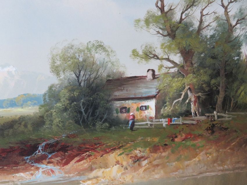 Ernst Jugel (German 1913-1985); Oil on canvas, rural landscape inc cottage in woodland with river before and mountains beyond. Signed lower right Jugel, sight size 78 x 58cm, marked Lukas to back of canvas, overall size 95 x 74.5cm.
