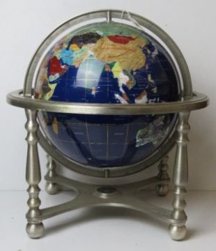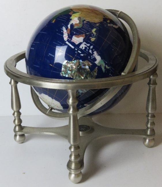 A semi-precious gemstone globe having compass to chromed metal base, overall dia approx 45cm and standing approx 50cm high.