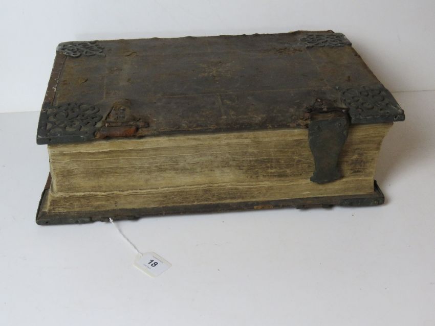 A large leather-bound bible dated 1782 to the frontispiece and in Latin having leather-bound wooden cover. Measuring 46 x 32 x 15cm. In need of restoration.