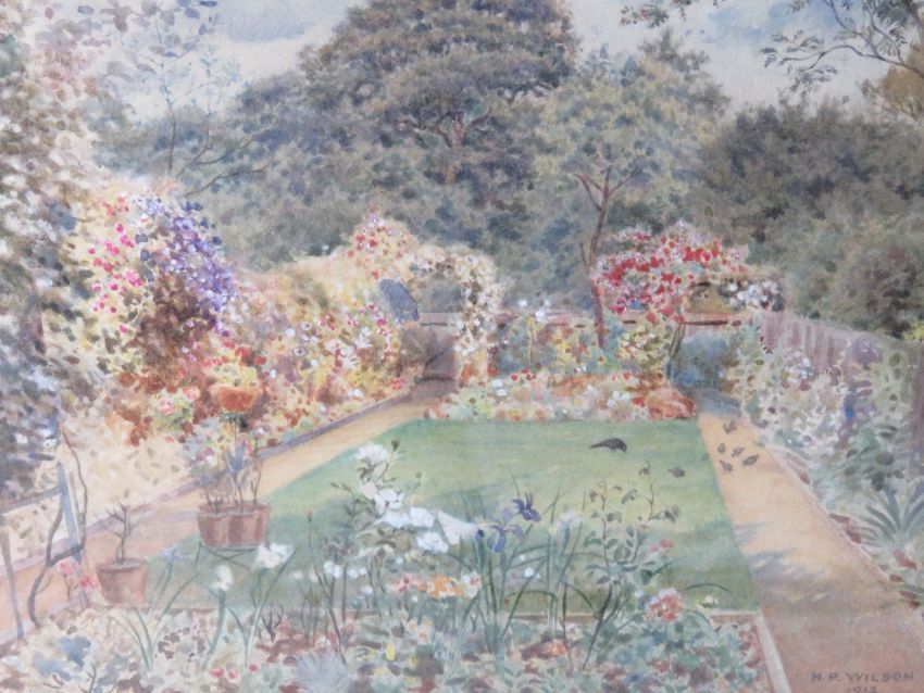 Watercolour; courtyard garden, lawn with paths surrounding, floral borders with arches walls and trees beyond, signed lower right H P Wilson 1912, mounted in gilt slip, sight size 24.5 x 23cm. Gilded wooden frame with applied composite decoration. Overall size 41 x 37.5.