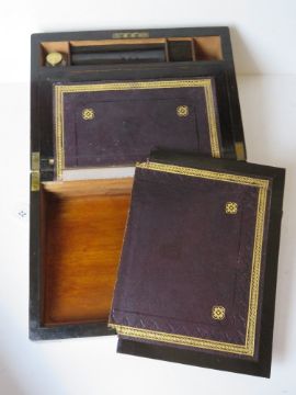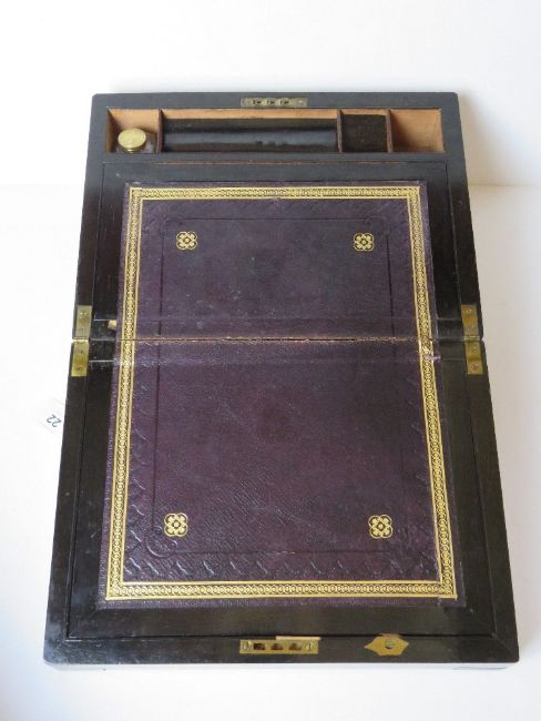 An antique writing slope having brass corner bracing, escutcheon and plate to lid, opening to reveal purple leather writing surface within (slight a/f), one glass inkwell and having mechanism secret compartment.