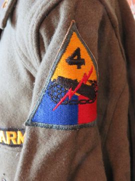 A US Army olive green wool field shirt and trousers, jacket dated 1953, trousers dated 1951, shirt size L and bears patch for 4th Battalion armoured division.