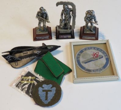 A quantity of assorted militaria inc Paratrooper 1944, Royal Marine Commando 1944 and Airbourne Forces Brigade 1944 figurines, shoulder boards, arm patches and a US Air Force Toy plane.