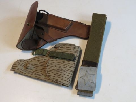 A Tokarev holster with magazine and cleaning rod, dated 1949, a Makarov holster and a Soviet belt buckle and belt.