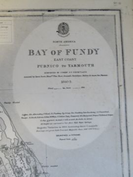 Navigational chart; engraved by J & C Walker, new edition published 9th Jan 1917, being North America, Bay of Fundy, East Coast, Pubnico to Yarmouth, compiled from surveys of Commr P F Shortland, measuring approx 102 x 69cm.