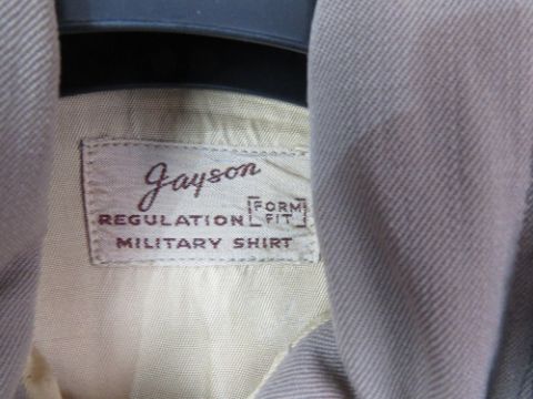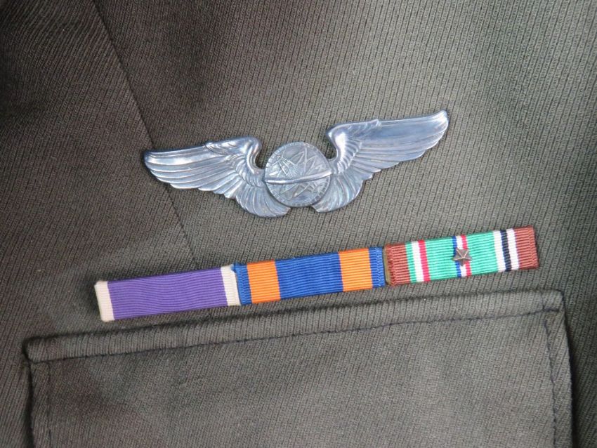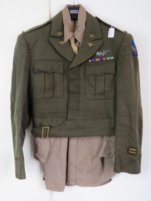 A WWII Regulation Officers tunic, shirt and tie, with Airforce badges, patches and a ribbon bar upon.