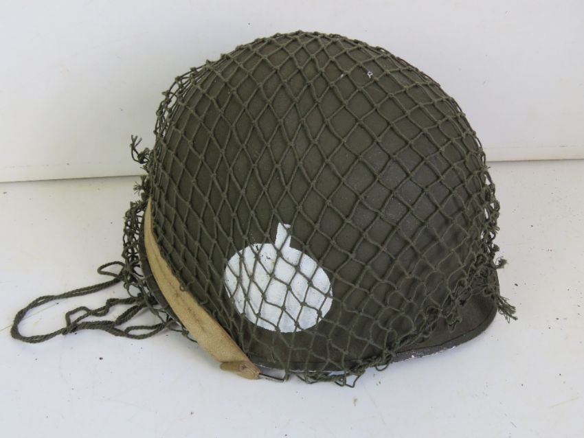 A Vietnam US M1 helmet with netting and chin strap.