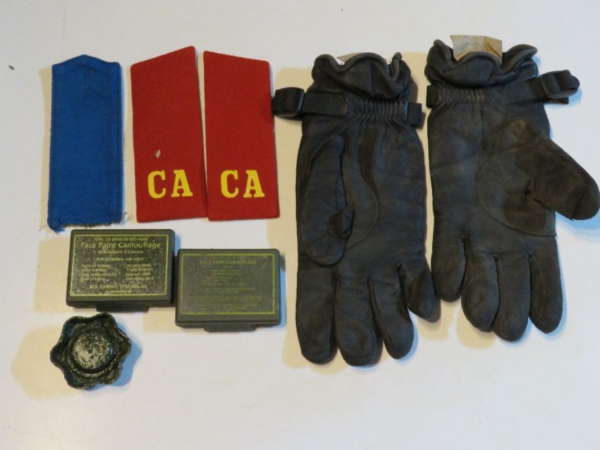 A quantity of asssorted militaria inc; British Field gloves, British camo cream, cap for anti tank mine, 9mm Browning holster, US Colt holster, shoulder boards, and a Royal Artillery banner.