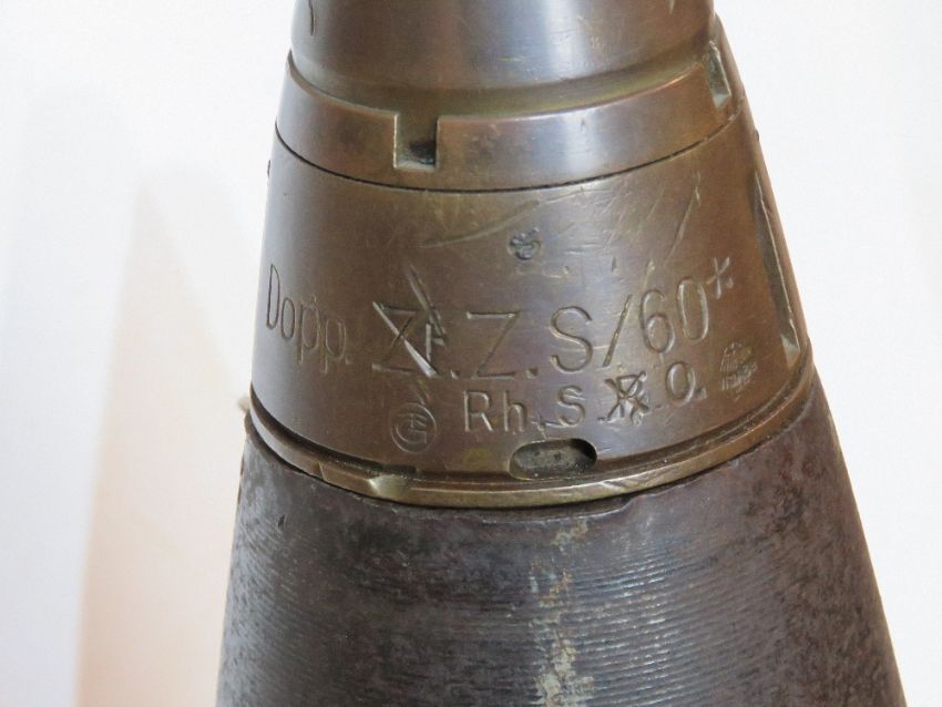 An inert WWII German 10.5cm 32st HE shell, WWII German marked and dated 1941 with makers mark aux, with early brass band and fuse.