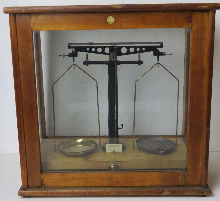 A set of balance scales in glazed case by Philip Harris Ltd Birmingham.