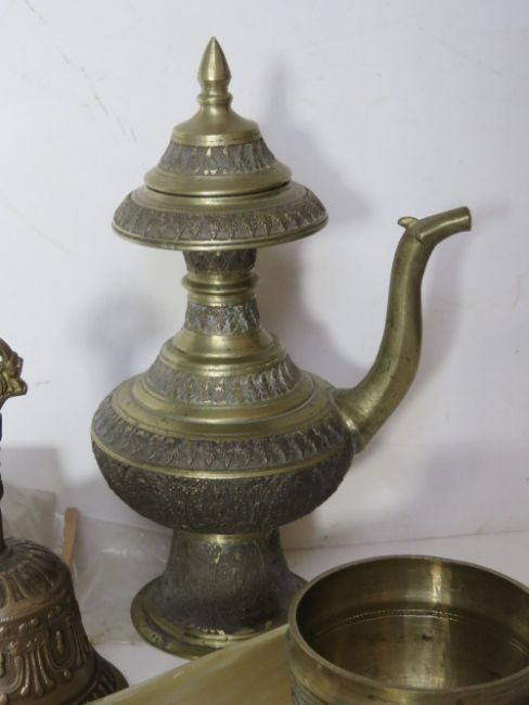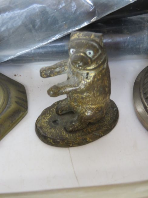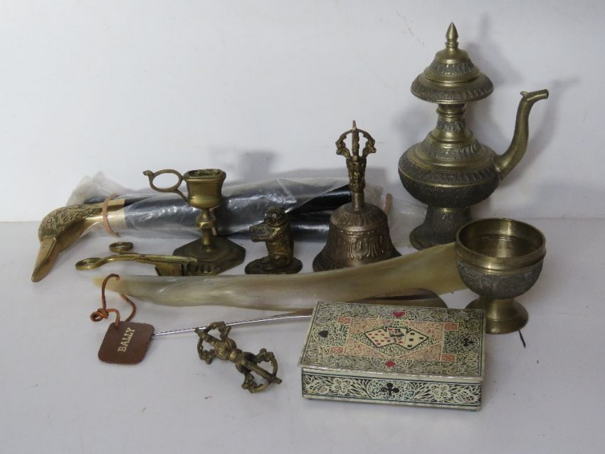 A quantity of assorted collectables including brass ducks head walking cane, brass bear match holder, wick cutters, etc.