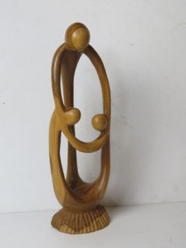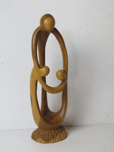 A carved wooden mother and children contemporary sculpture.