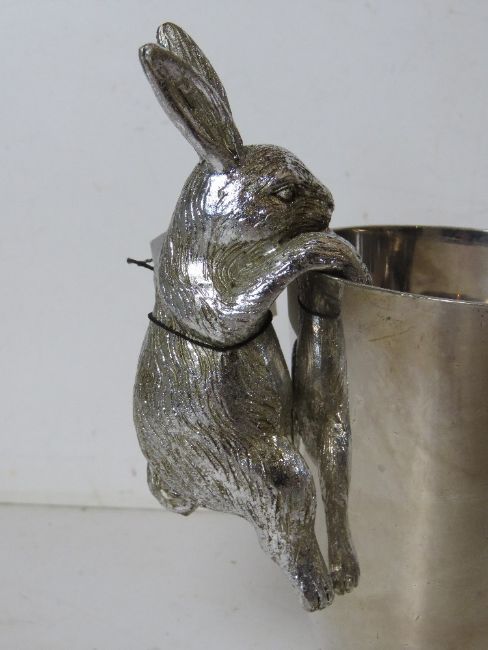A silver painted rabbit wine cooler decoration, as new with tag.