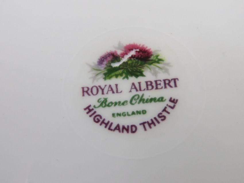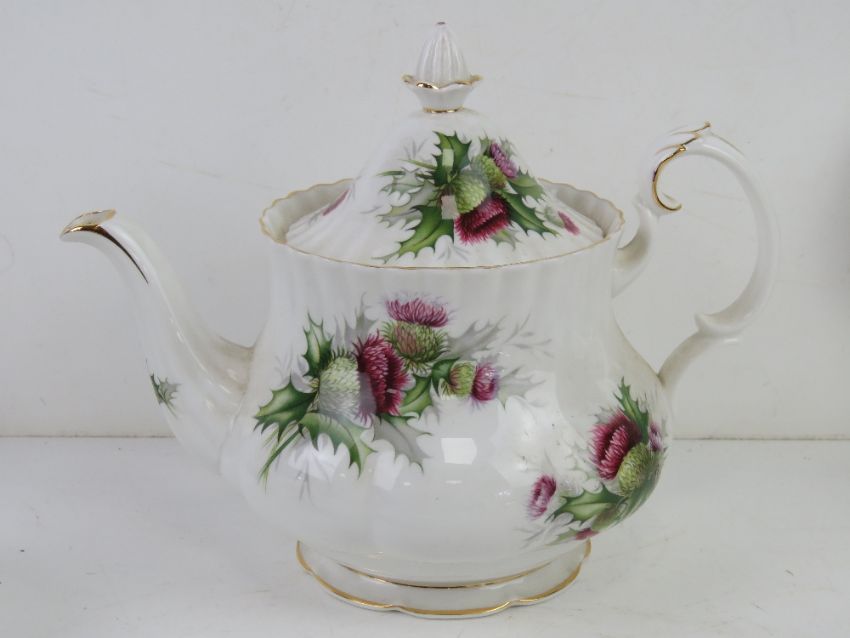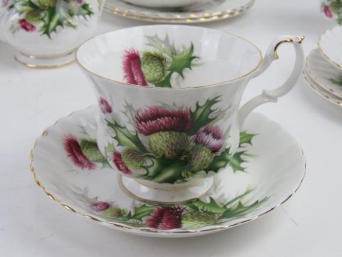 Royal Albert; Highland Thistle pattern tea service, comprising six trios (cup, saucer, side plate), additional cup, teapot, jug, sugar bowl, and two sandwich plates.