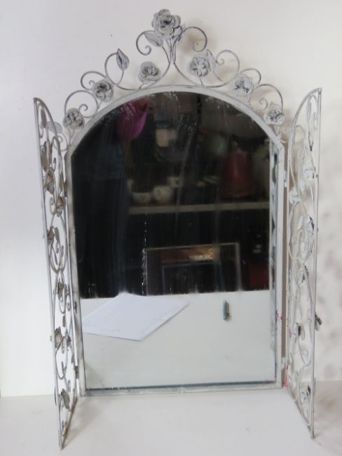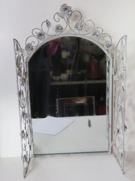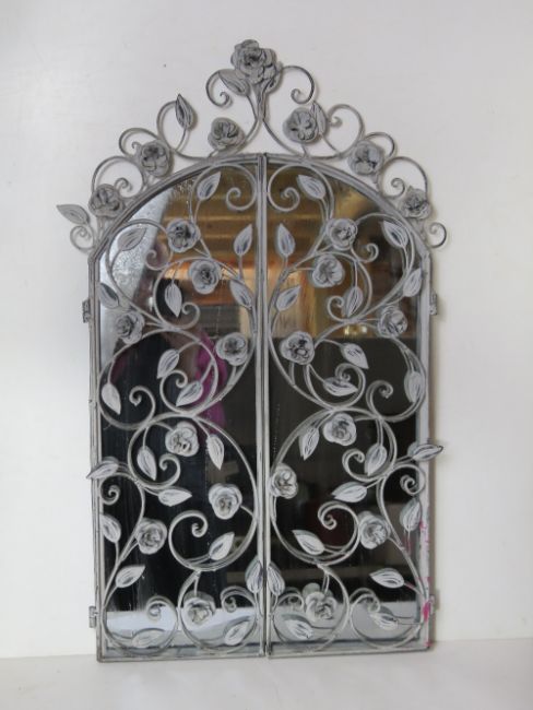 A contemporary metal floral 'window' mirror having opening 'shutters'.